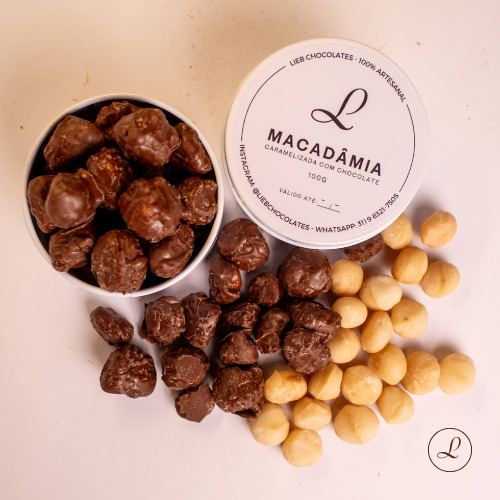 As Macadâmias Caramelizadas com Chocolate da Lieb são a união perfeita entre crocância, leveza e sabor. Selecionamos as melhores macadâmias e as transformamos em um produto fino, com um toque único, para proporcionar uma experiência sofisticada e deliciosa. Delicadas e envolventes, elas são uma escolha saudável, elegante e irresistível para presentear ou saborear no dia a dia. Disponível em dois tamanhos: • 100g – na charmosa latinha, ideal para presentear ou guardar com estilo. • 400g – no pote reutilizável, lindo e prático.